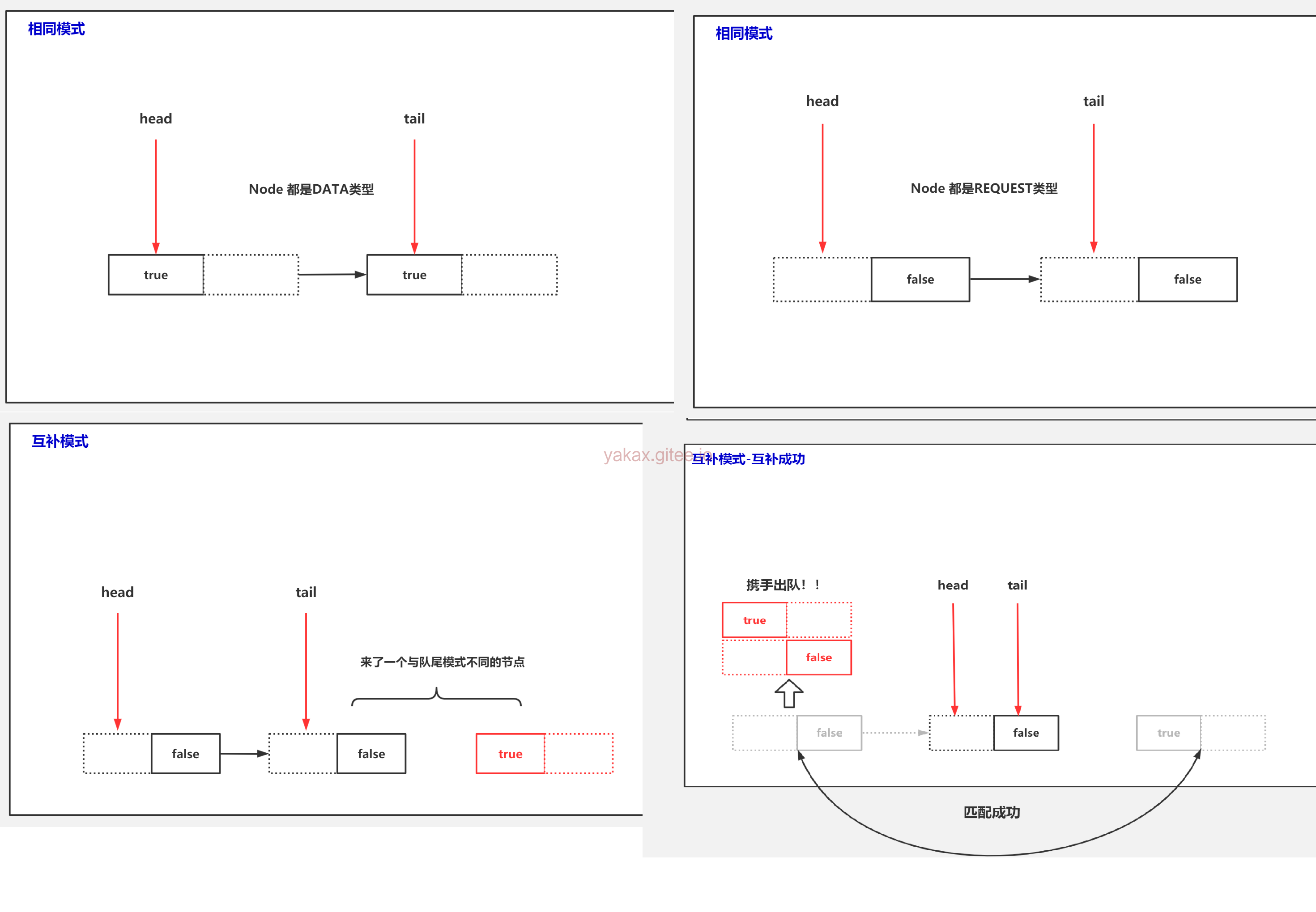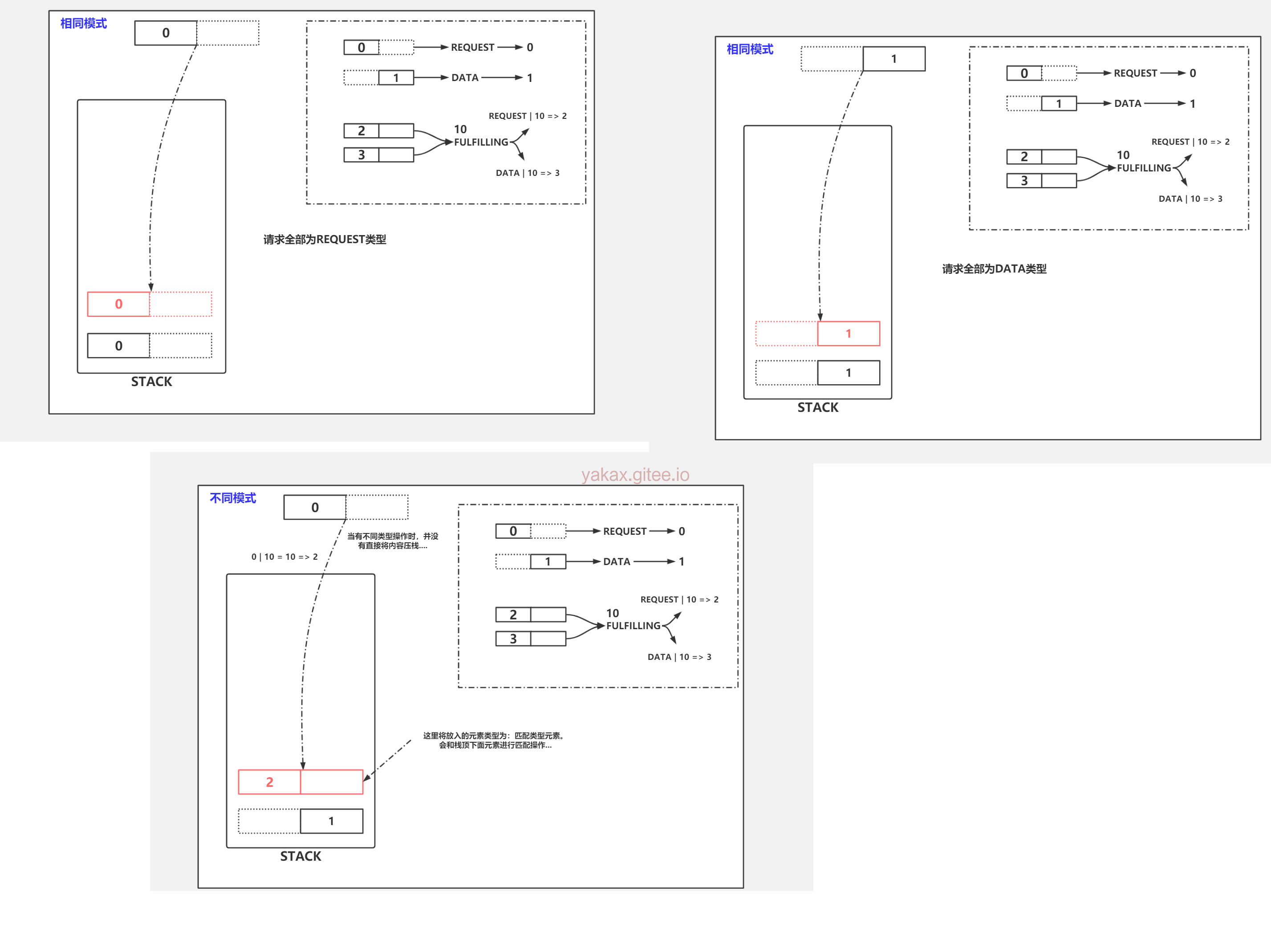 * 假设栈顶元素为 REQUEST-NODE,当前请求类型为 DATA的话,入栈会修改类型为 FULFILLING 【栈顶 & 栈顶之下的一个node】。